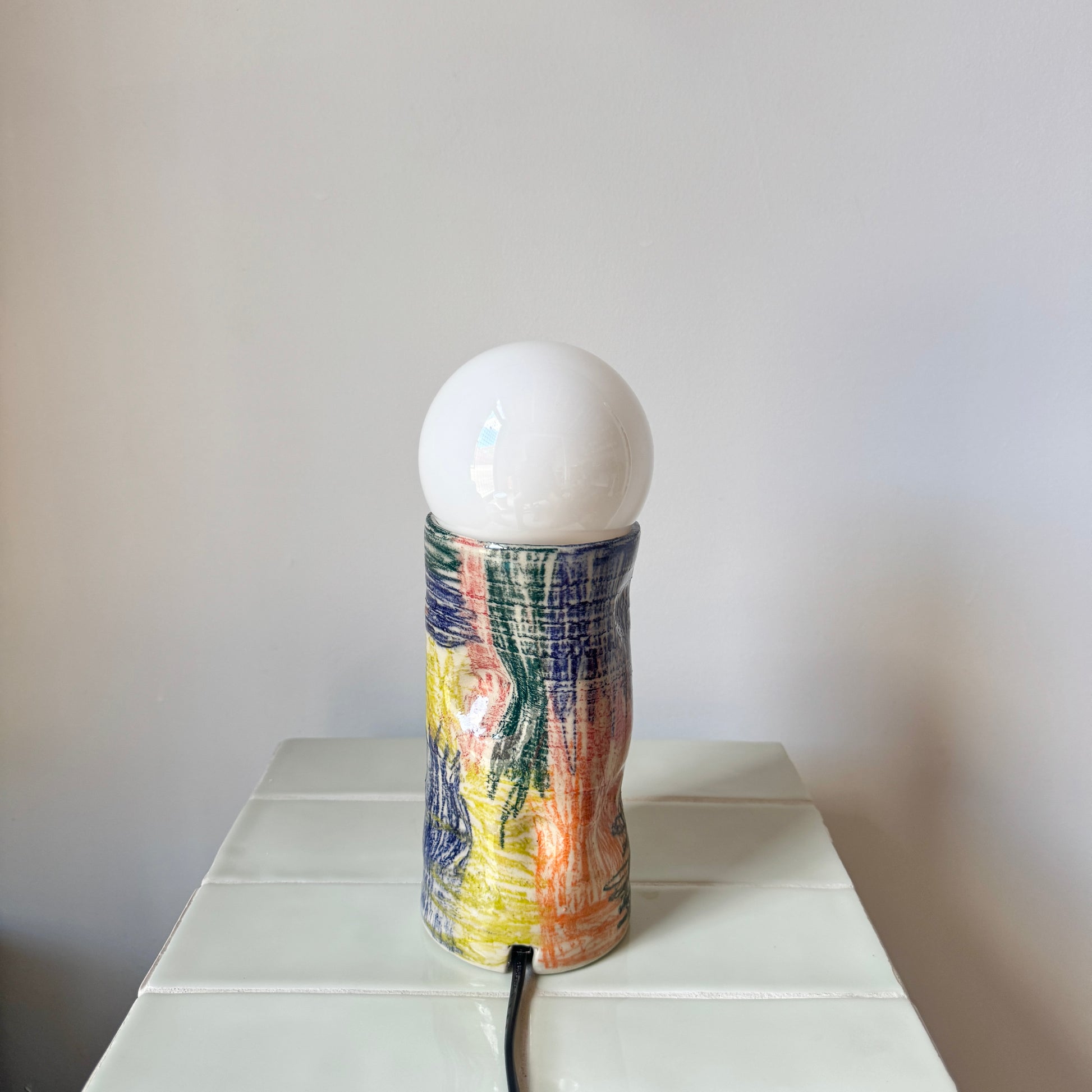 The lamp base is ceramic and has been hand crafted and painted in Melbourne, Australia.